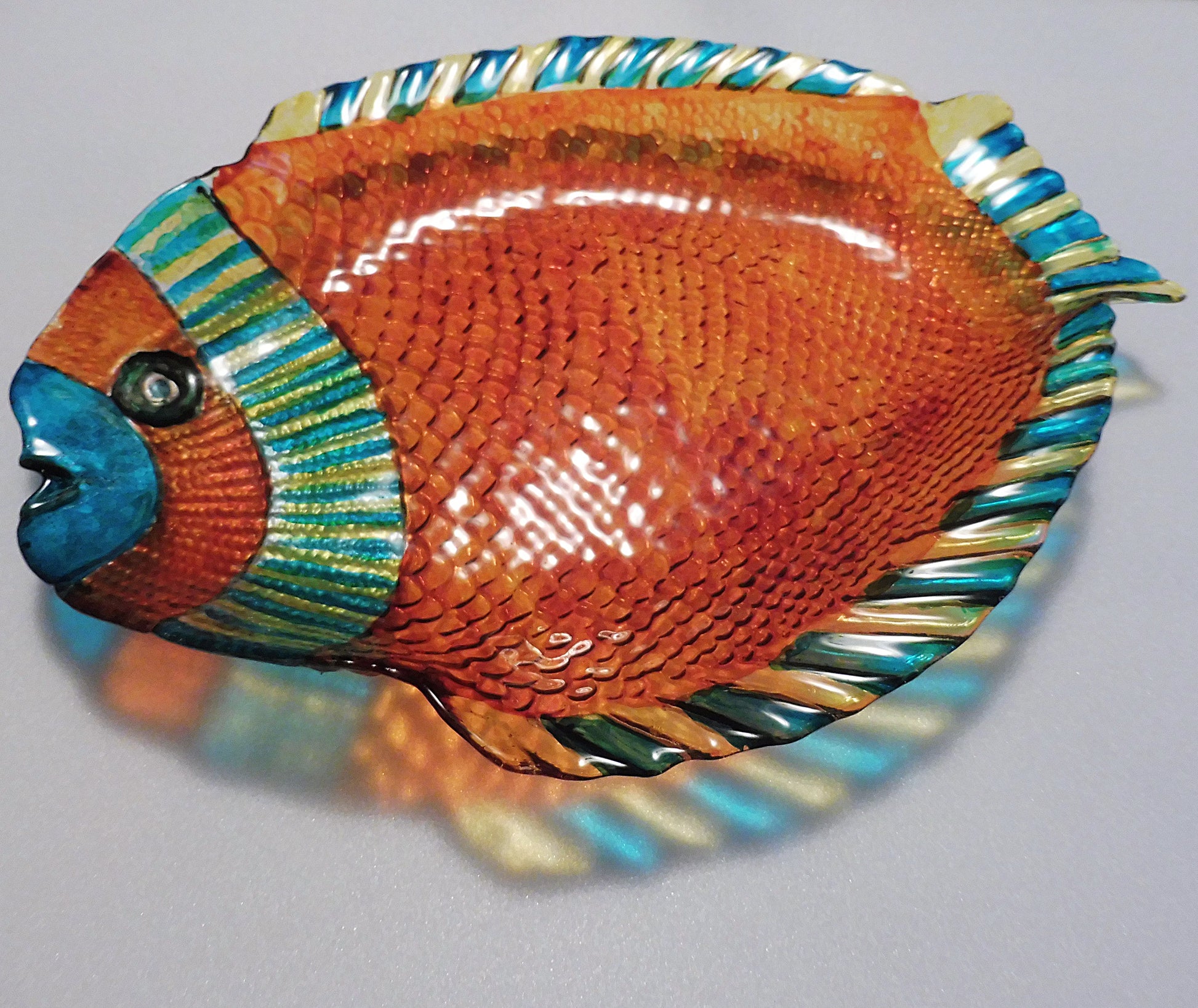 This decorative plate offers a unique look to any decor. With hand painted glass and a detailed orange fish design, this plate is the perfect addition to any home. The fish glass plate stands out in any setting, bringing a touch of beauty and art to any room.